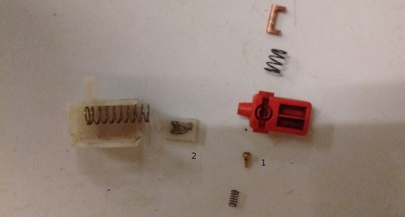 The failure was due to the little piece of plastic (2) being worn out. This part is actually a multi-path guide for the pin (1), so that when you push once, the button stays in, while another push will release it.